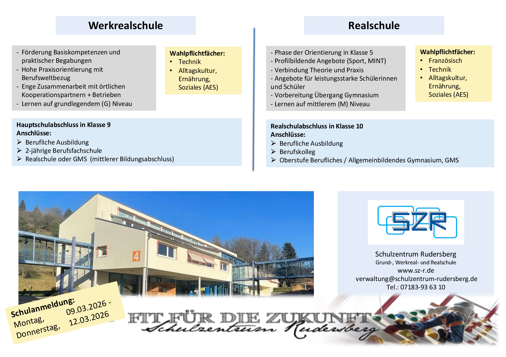 Das Schulzentrum Rudersberg ist eine Verbundschule, in der die drei Schularten Grund-, Werkreal- und Realschule zusammengefasst sind. Alle leben, lachen und lernen zusammen unter einem Dach. Die Beziehungen zwischen allen Beteiligten in unserer Schule sind bestimmt von gegenseitigem Respekt, Rücksichtnahme und Offenheit.